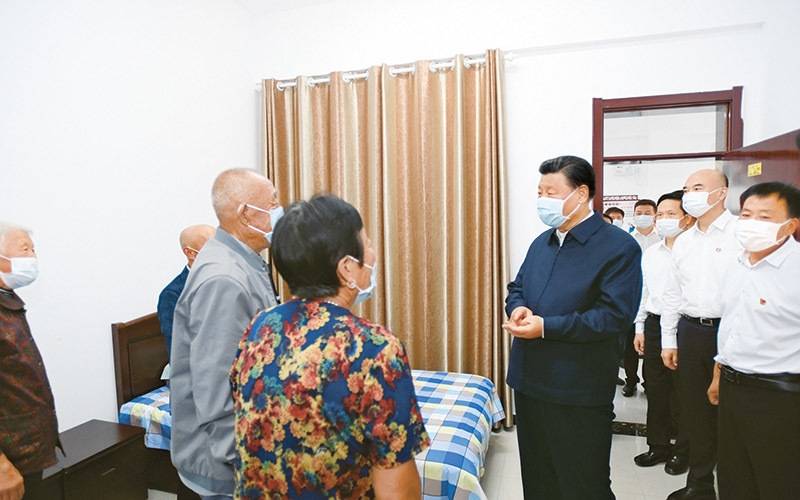 2021年9月13日至14日,中共中央总书记、国家主席、中央军委主席习近平在陕西省榆林市考察。这是14日下午,习近平在绥德县张家砭镇郝家桥村互助幸福院,同村里的老人亲切交流。 新华社记者 李学仁/摄