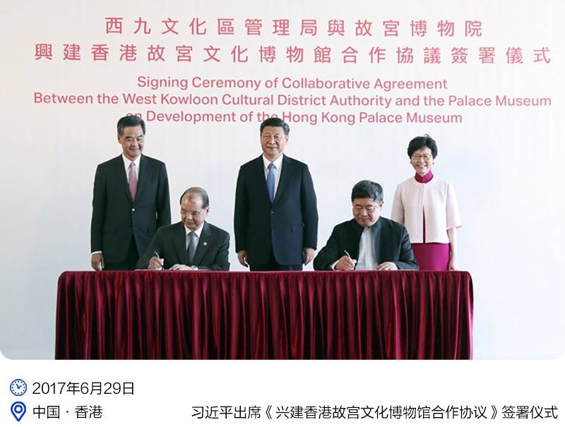 2017年6月29日,习近平主席抵达香港当天,便风尘仆仆前往西九文化区考察,见证西九文化区管理局和故宫博物院签署《兴建香港故宫文化博物馆合作协议》。