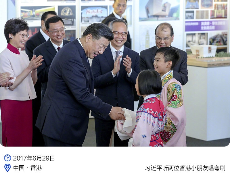 2017年香港之行,习近平主席在西九文化区观看了两名儿童演唱粤剧选段,称赞他们年纪虽小,但演唱很到位。“很高兴看到你们这么喜欢粤剧,这说明香港粤剧后继有人,也说明中华优秀传统文化具有顽强生命力。”习近平主席表示,“希望大家珍惜机遇,勤学苦练,多同内地同行交流切磋,为广大粤剧爱好者奉献精彩演出,为传承中华优秀传统文化作出自己的贡献。”