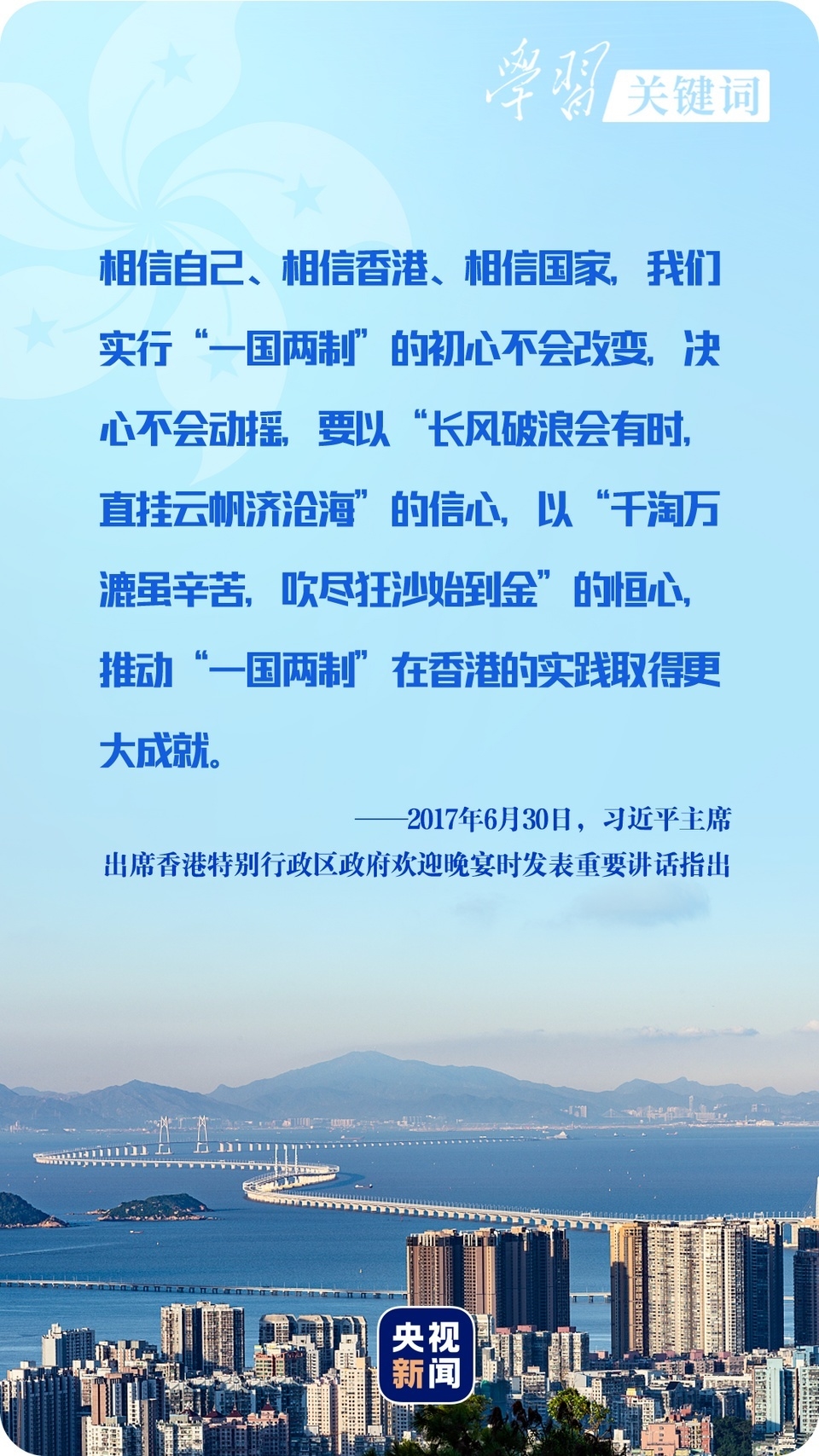 2017年6月30日,在美丽的香江,习近平主席抚今追昔,感慨万千,并深情寄予香港同胞“三个相信”——“相信自己”“相信香港”“相信国家”。