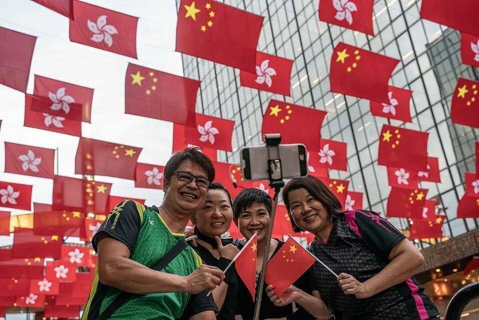 △2021年7月1日,香港市民在街头挥舞五星红旗,庆祝中国共产党成立100周年及香港回归祖国24周年。