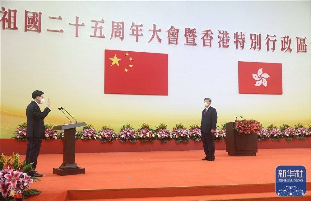 7月1日上午,庆祝香港回归祖国25周年大会暨香港特别行政区第六届政府就职典礼在香港会展中心隆重举行。中共中央总书记、国家主席、中央军委主席习近平出席并发表重要讲话。这是习近平监誓,李家超宣誓就任香港特别行政区行政长官。 新华社记者 鞠鹏 摄