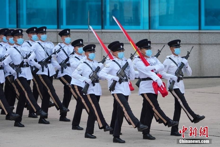 2021年7月1日,香港特别行政区政府在金紫荆广场举行升旗仪式,庆祝香港回归祖国及香港特别行政区成立24周年。图为七一升旗礼护旗方队首次以中式步操入场。中新社记者 张炜 摄