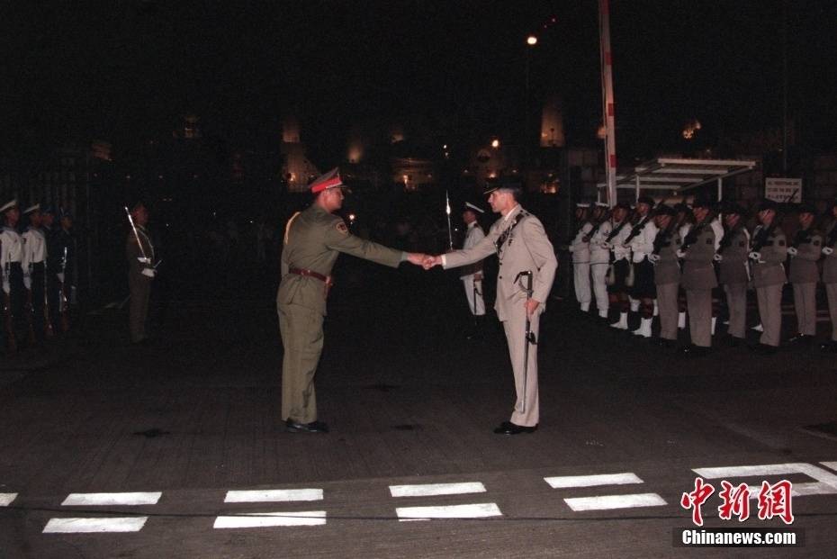 1997年7月1日,中国人民解放军驻港先头部队在添马舰英军司令部威尔斯亲王军营与英军交接防务。中新社发 陈德 摄