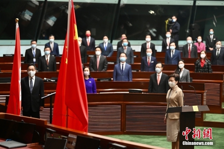 2022年1月3日,香港特区第七届立法会议员宣誓仪式在立法会综合大楼会议厅进行,监誓人特区行政长官林郑月娥确定全体90位候任立法会议员的宣誓为有效宣誓。图为林郑月娥与议员面向国旗及区旗唱国歌。中新社记者 李志华 摄
