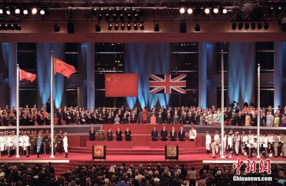 1997年7月1日零点,在雄壮的中华人民共和国国歌声中,中华人民共和国国旗和香港特别行政区区旗冉冉升起。中新社发 李刚 摄