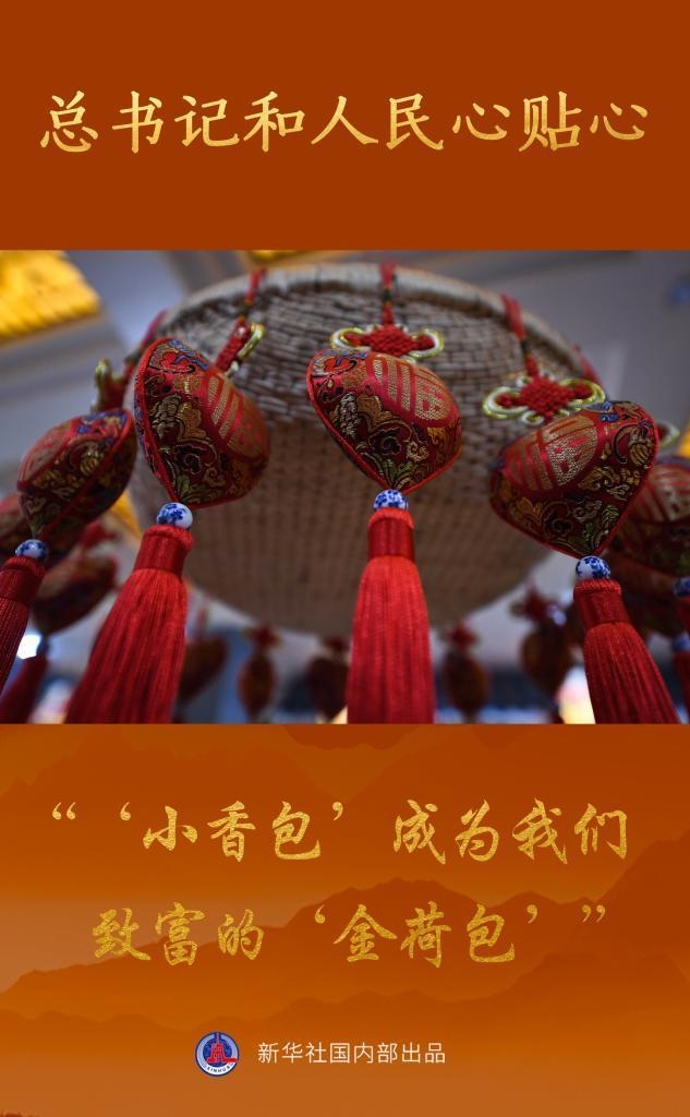 习近平总书记在考察时指出,发展特色产业、特色经济是加快推进农业农村现代化的重要举措,给我们指明了发展方向。这些年,按照总书记的要求,我们积极发展特色产业,成立民俗文化手工艺合作社,培育中药香包的制作能手,搭建网络销售平台,加强产运销“一条龙”服务。如今,香包产业不断发展壮大,还远销海外。有的年轻人脑子灵,跟文化创意公司合作,推出各种时尚小香包,在网上直播带货,很受大家欢迎。