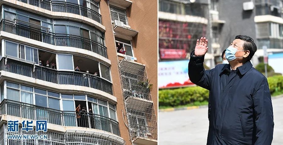 2020年3月10日,习近平专门赴湖北省武汉市考察新冠肺炎疫情防控工作。这是习近平在东湖新城社区考察时,向在家隔离居住的居民挥手致意、表示慰问(拼版照片)。 新华社记者 谢环驰 摄
