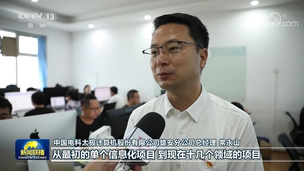 中国电科太极计算机股份有限公司雄安分公司总经理 常永山:我们刚来新区的时候,团队只有两三个人,经过这几年的发展已经有一百二三十人了,从最初单个的信息化项目,到现在十几个领域的项目。