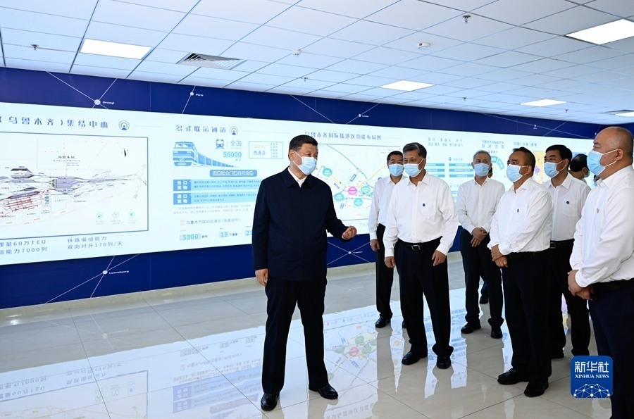 12日,习近平总书记来到乌鲁木齐国际陆港区考察。在大屏幕前,习近平总书记通过实时画面察看中欧班列(乌鲁木齐)集结中心各功能区和阿拉山口口岸、霍尔果斯口岸现场作业情况。