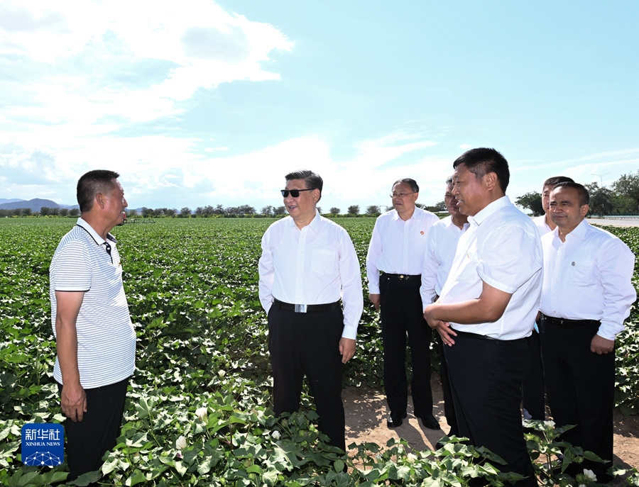 13日,习近平总书记来到新疆生产建设兵团八师石河子市。他参观新疆兵团军垦博物馆,走进田间察看棉花长势,同兵团干部群众亲切交谈……