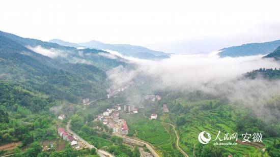 雨后的金寨县大湾村,云雾环绕宛如仙境。人民网 张俊摄