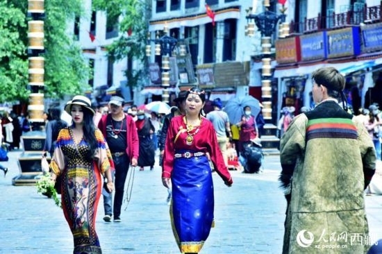 2022年5月,西藏迎来旅游旺季,游客身着藏装在八廓街拍照留念。人民网 李海霞 摄