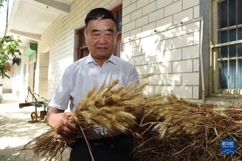徐淙祥在安徽太和县淙祥现代农业种植专业合作社察看小麦样品(2022年6月28日摄)。新华社记者 周牧 摄
