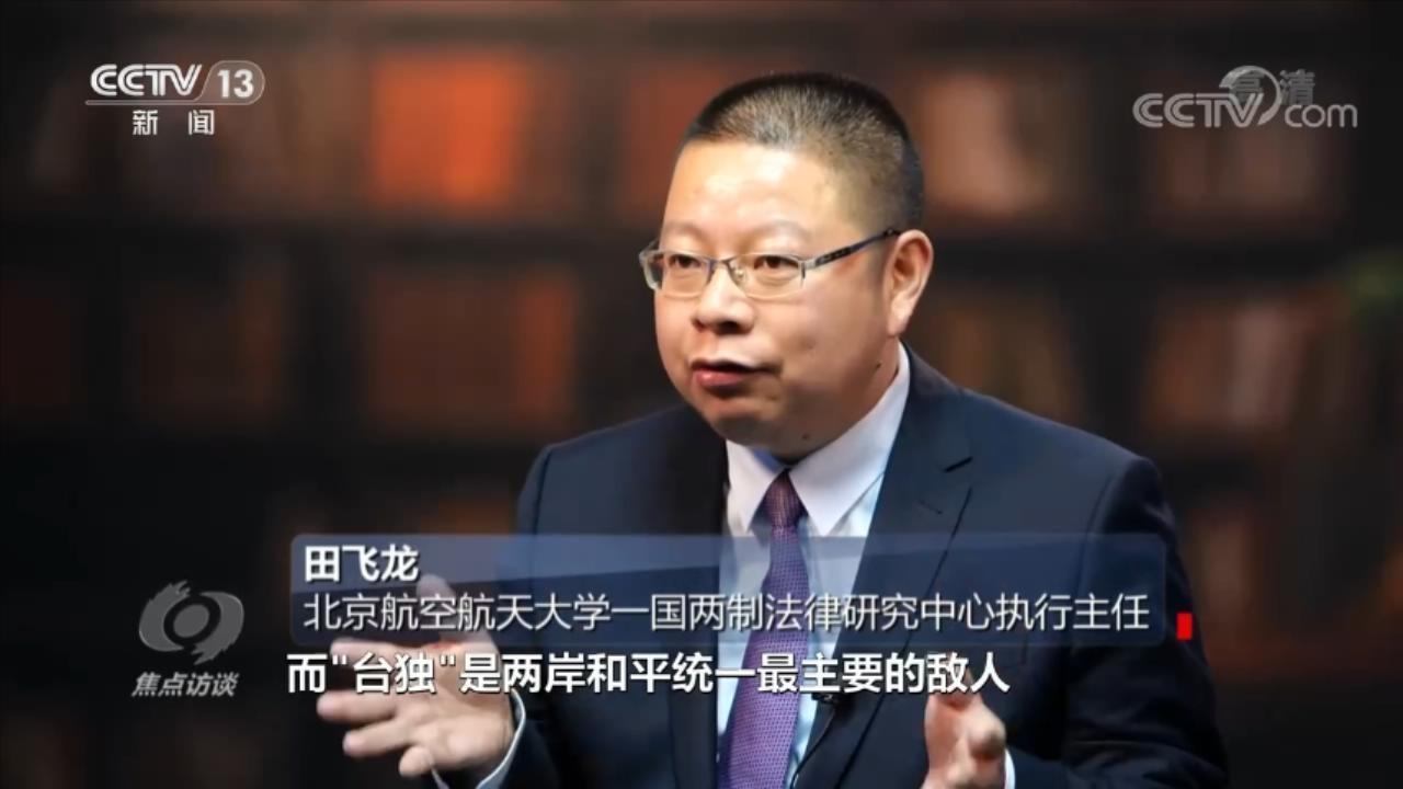 田飞龙说:“民进党是最主要的‘台独’力量,而‘台独’是两岸和平统一最主要的敌人,所以我们要牢牢抓住两岸关系主要矛盾所在,主要矛盾就是‘台独’跟民进党裹挟了台湾民众,阻断了和平统一的进程,要清除障碍,和平统一的道路才能够通畅起来。”