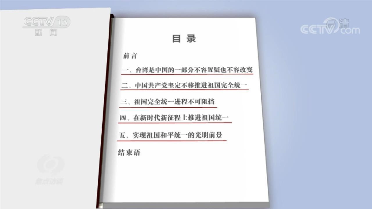 央视网消息(焦点访谈):解决台湾问题、实现祖国完全统一,是全体中华儿女的共同愿望,是实现中华民族伟大复兴的必然要求,是中国共产党矢志不渝的历史任务。8月10日,国务院台湾事务办公室、国务院新闻办公室发表《台湾问题与新时代中国统一事业》白皮书。这是中国政府继1993年和2000年之后发表的有关台湾问题的第三份白皮书。这份白皮书重点阐述了什么?对海内外发出什么样的信号?对坚决遏制“台独”分裂行径和外部势力干涉、坚定捍卫国家主权和领土完整又发出了什么样的声音?一起听听专家的分析。