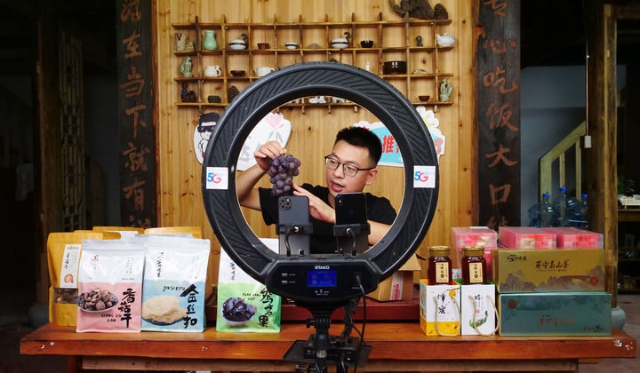 2021年8月17日,返乡创业青年陈上友在下党村78号直播间向粉丝介绍当地的农产品。新华社记者周义摄