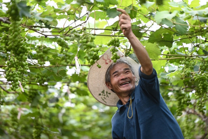 2022年6月23日,村民吴通兴在下党村康庄葡萄园劳作。吴通兴在葡萄园一天收入200元。新华社记者周义摄