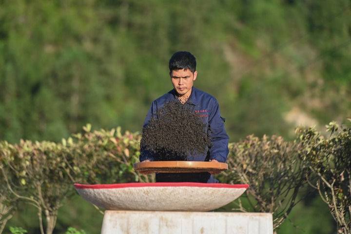 2022年6月23日,村民周建伟在下党村的茶厂制茶。茶是下党村的支柱产业之一,近300户村民种植茶叶。新华社记者周义摄