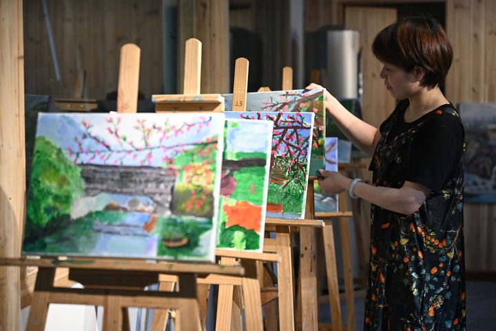 2022年6月23日,吴祥芳在下党村下党画苑摆放画作。吴祥芳从外地来到下党村创业,她的作品主要描绘下党村的发展变化,经营的画苑年营收超过10万元。新华社记者周义摄
