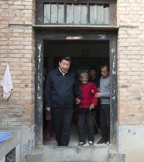 2014年3月17日至18日,习近平在河南省兰考县调研指导党的群众路线教育实践活动。图为3月17日,习近平在东坝头乡张庄村看望85岁老人张景枝。新华社记者 李学仁摄