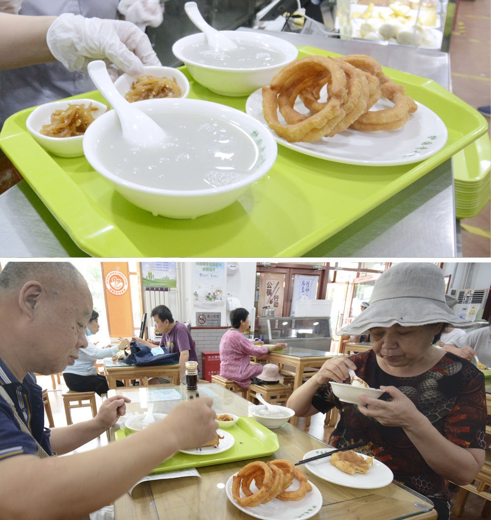 上图:2022年7月13日在北京护国寺小吃红莲店拍摄的豆汁和焦圈。下图:2022年7月13日,市民在护国寺小吃红莲店吃豆汁和焦圈等早点。