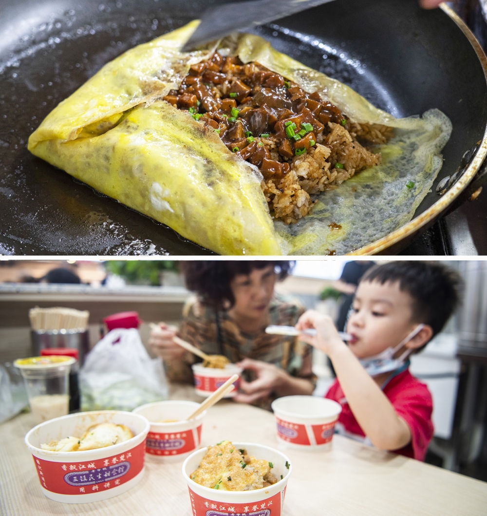 上图:2020年4月2日,在武汉江岸区一饭店,厨师制作三鲜豆皮。下图:2022年7月28日,在武汉市粮道街一小吃店,顾客享用三鲜豆皮。