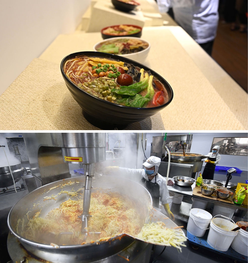 上图:2021年4月29日拍摄的广西柳州市螺蛳粉饮食文化博物馆展品。下图:2020年1月2日,在广西柳州市螺蛳粉产业园一公司生产车间,工人在加工酸笋。近年来,速食螺蛳粉产品发展迅猛,成为“网红”食品。柳州市通过延伸螺蛳粉产业链,在各区县打造一批田螺、豆角、木耳、酸笋等螺蛳粉原材料生产基地,进一步做优做强螺蛳粉产业,帮助群众就业增收。2021年,柳州螺蛳粉全产业链销售收入达501.6亿元人民币,产品远销全球20多个国家和地区。