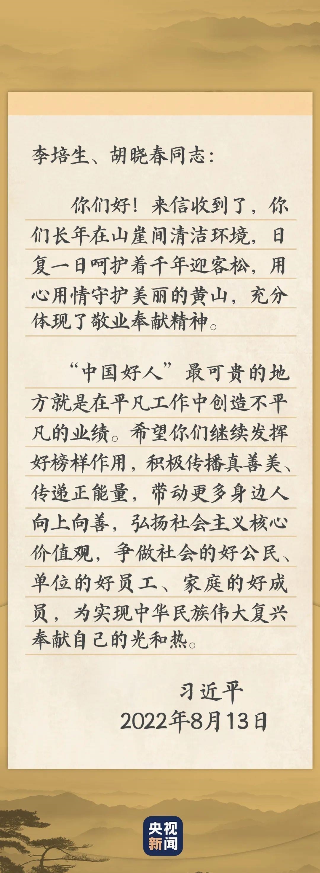 黄山之巅,迎客松畔。双手接过总书记的回信,“中国好人”李培生和胡晓春热泪盈眶。
