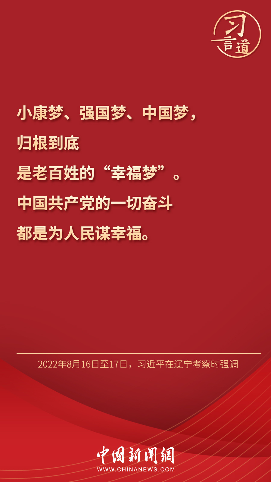 2022年8月16日至17日,中共中央总书记、国家主席、中央军委主席习近平在辽宁考察时强调,小康梦、强国梦、中国梦,归根到底是老百姓的“幸福梦”。