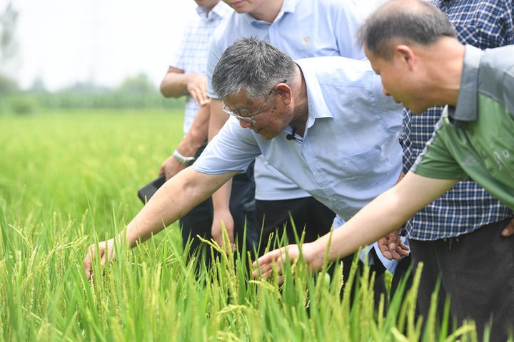 在江苏省句容市天王镇戴庄村,农业专家赵亚夫(中)带着团队成员查看有机水稻长势(2021年7月6日摄)。新华社记者 季春鹏 摄