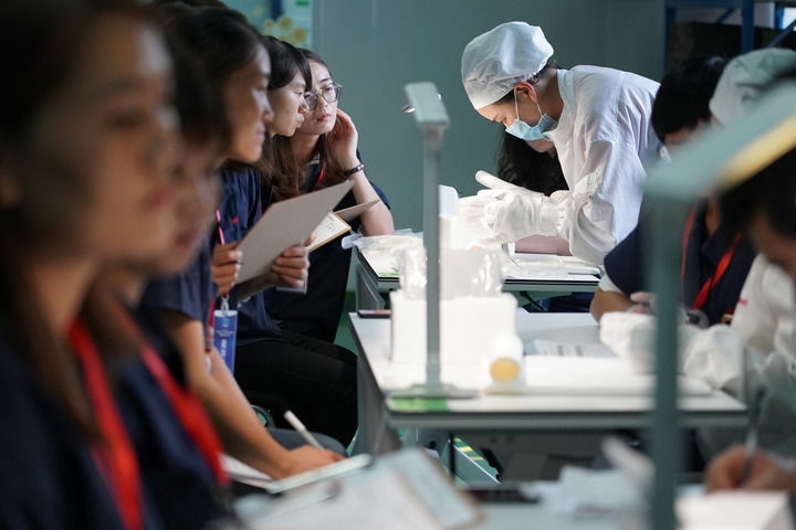 在西安市2019年高技能人才技能大赛暨新能源新材料技能竞赛决赛上,参赛选手(右)现场查看硅片的外观(2019年9月5日摄)。新华社记者 邵瑞 摄