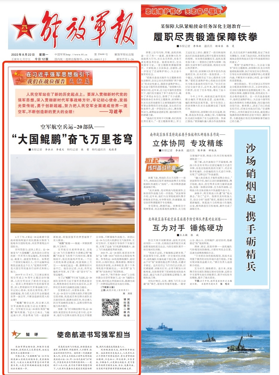 “鲲鹏”横空出世,标志着人民空军战略投送能力迈出关键性一步。空军航空兵运-20部队驾驭“鲲鹏”御风展翅,飞过大江南北、飞越远海大洋,用奋勇高飞的一道道崭新航迹,将强国强军的梦想铺展于世人眼前。