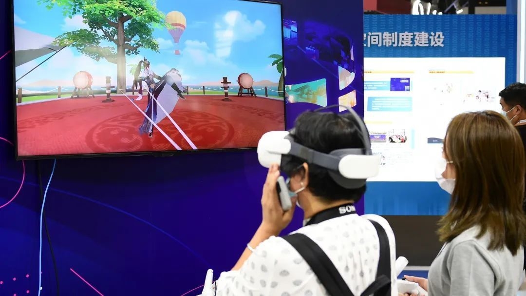 28日,2022年中国网络文明大会在国家会展中心(天津)拉开帷幕,参观者在广东馆通过VR体验洪拳。(图片来源:CFP)