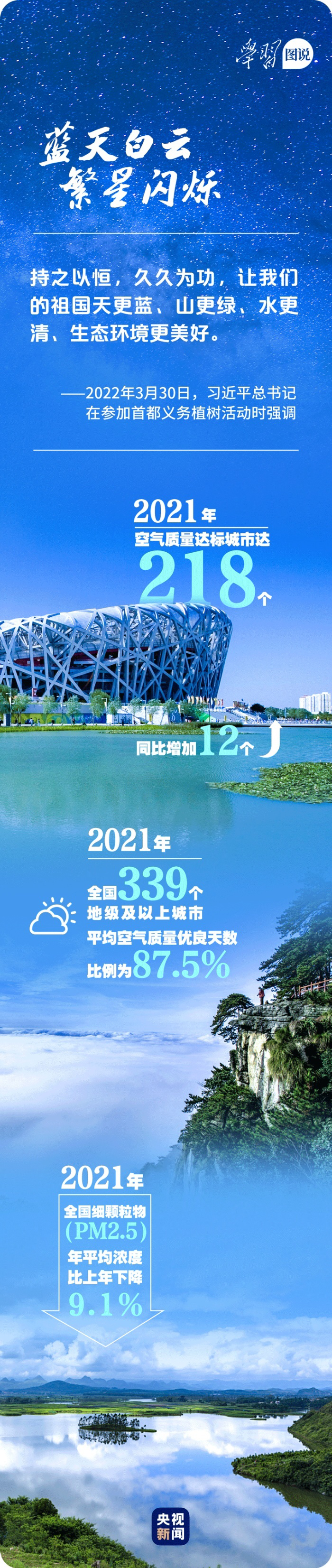 在习近平生态文明思想指引下,我国持续加强生态环境保护,共建人与自然和谐共生的美丽家园。一幅蓝天白云、繁星闪烁,清水绿岸、鱼翔浅底,吃得放心、住得安心,美丽乡村、鸟语花香的中国画卷正徐徐展开。