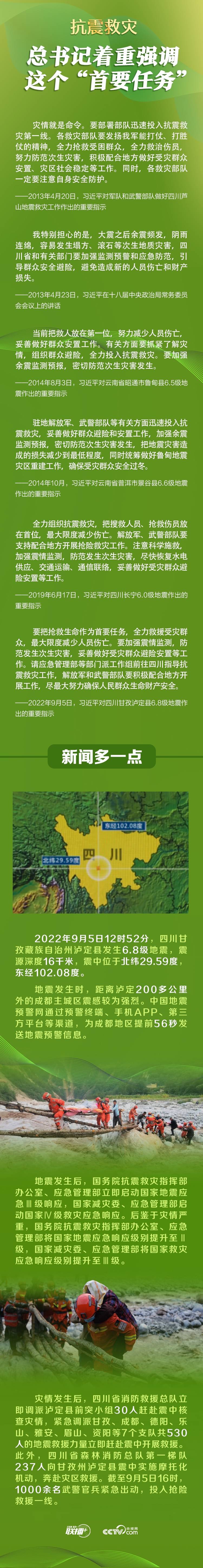 北京时间9月5日12时52分,四川甘孜藏族自治州泸定县发生6.8级地震。地震发生后,习近平总书记高度重视并作出重要指示,要求把抢救生命作为首要任务,全力救援受灾群众,最大限度减少人员伤亡。