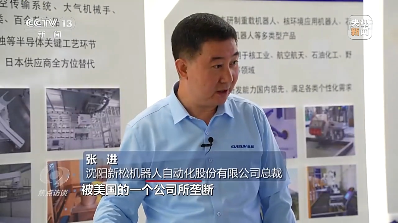 沈阳新松机器人自动化股份有限公司总裁 张进:以前这款装备完全都是被美国的一个公司所垄断,新松公司经过十多年时间的研发,我们已经成功打破了这种垄断的局面。
