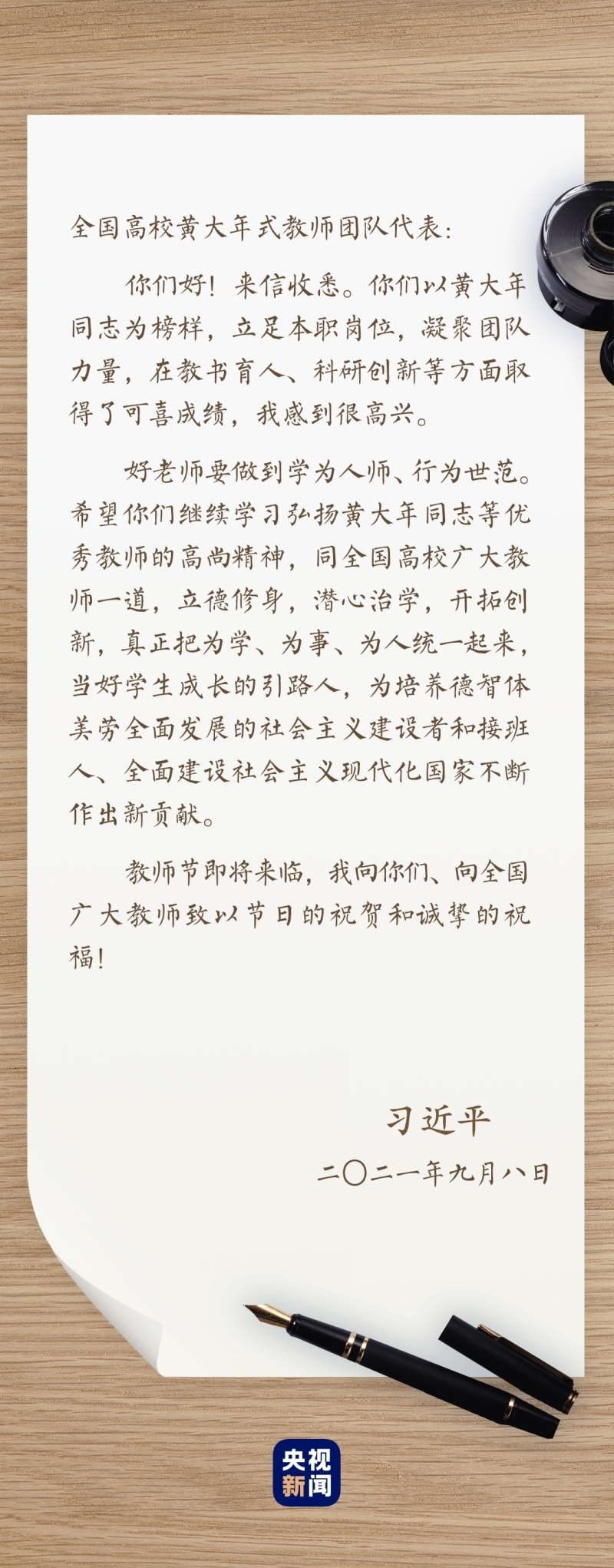 2021年教师节前夕,首批黄大年式教师团队的代表给习近平总书记写信,表达了坚守教育报国理想、为民族复兴贡献力量的决心。习近平总书记回信勉励大家,继续学习弘扬黄大年同志等优秀教师的高尚精神,立德修身,潜心治学,开拓创新,真正把为学、为事、为人统一起来,当好学生成长的引路人。