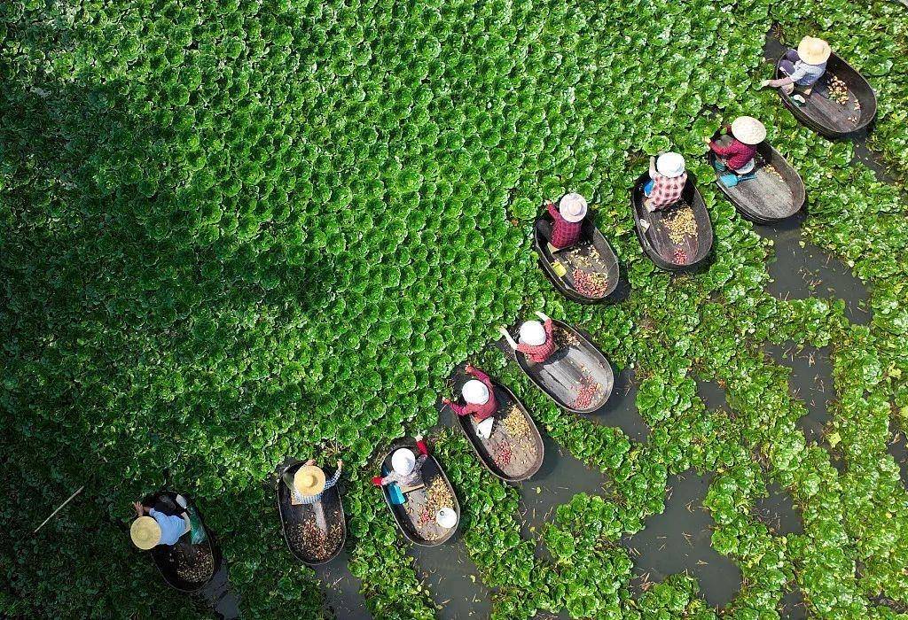 2022年9月7日,浙江湖州德清县四都村菱塘,村民在水面采菱。