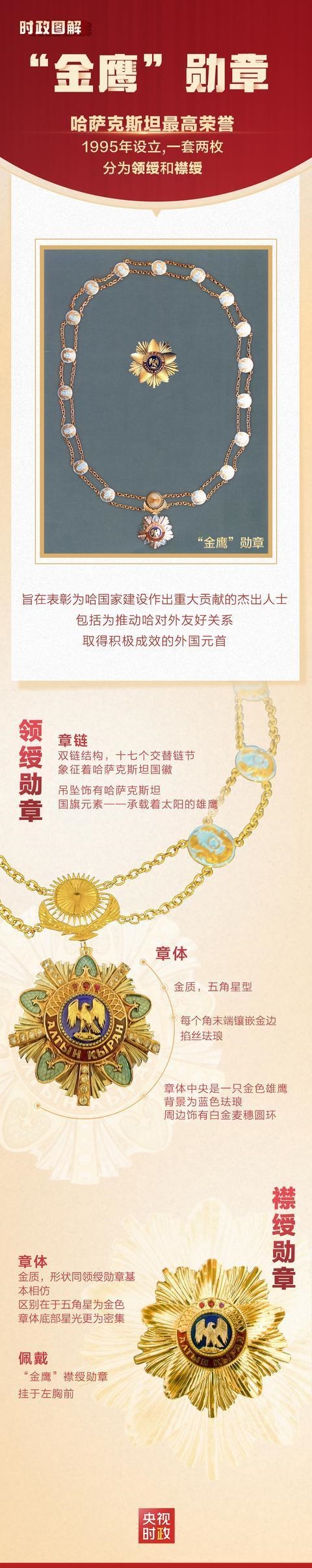 “金鹰”勋章,哈萨克斯坦最高荣誉,1995年设立,旨在表彰为哈国家建设作出重大贡献的杰出人士,包括为推动哈对外友好关系取得积极成效的外国元首。