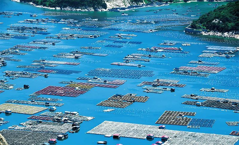 2022年8月15日,福建省连江县奇达村连成片的渔排宛如一座“海上牧场”(无人机照片)。奇达村是一个集齐了“山、海、岛、渔村”等元素的千年古村落,是天然的避风良港,适合养殖鲍鱼、海带等海产品。 中新社记者 王东明/摄