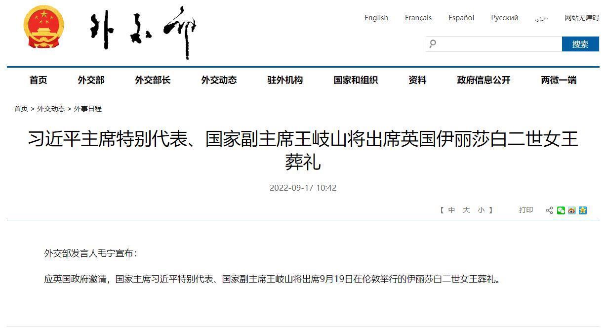 应英国政府邀请,国家主席习近平特别代表、国家副主席王岐山将出席9月19日在伦敦举行的伊丽莎白二世女王葬礼。