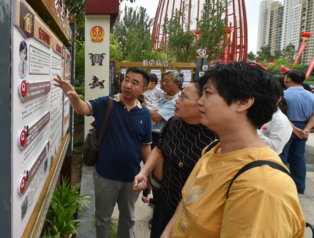 在天津市津南区海河故道公园民法典主题长廊,市民在讨论主题长廊展板上的法律案例(2020年8月20日摄)。新华社记者 孙凡越 摄