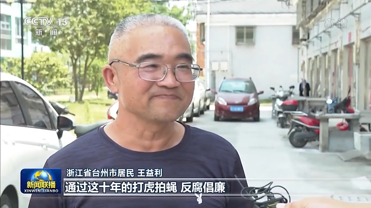 浙江省台州市居民 王益利:通过这十年的打虎拍蝇,反腐倡廉,公款吃喝、公车私用现象也越来越少了,干部的工作作风更加扎实了,为民服务的观念也进一步提高了,我们的社会风气也越来越好了。