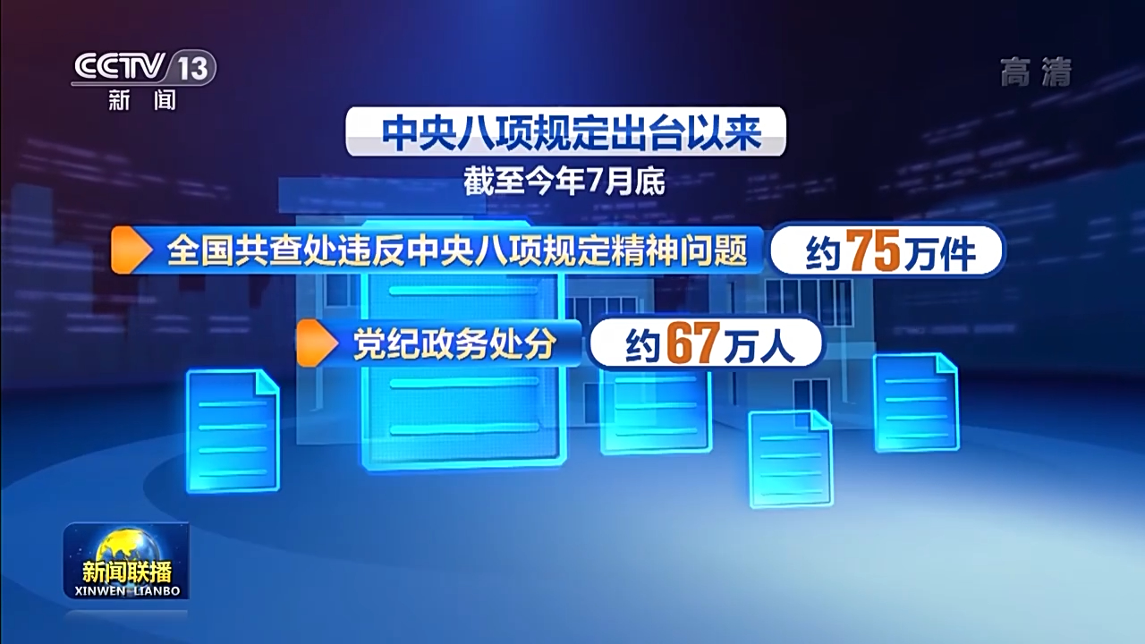 中央八项规定出台以来,截至今年7月底,全国共查处违反中央八项规定精神问题约75万件,党纪政务处分约67万人。十年来,作风建设“小切口”推动正风肃纪反腐实现“大变革”,党风政风持续净化,腐败滋生的空间逐步压缩,不断营造平稳健康的经济环境、国泰民安的社会环境、风清气正的政治环境。