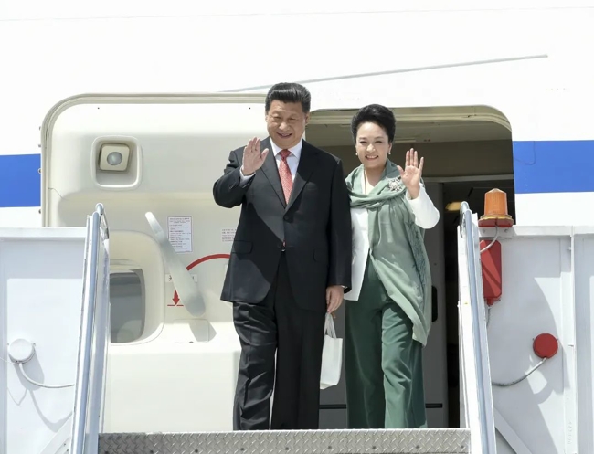 2015年4月20日,国家主席习近平抵达伊斯兰堡,开始对巴基斯坦进行国事访问。图为习近平主席和夫人彭丽媛向欢迎人群挥手致意。新华社记者李学仁摄