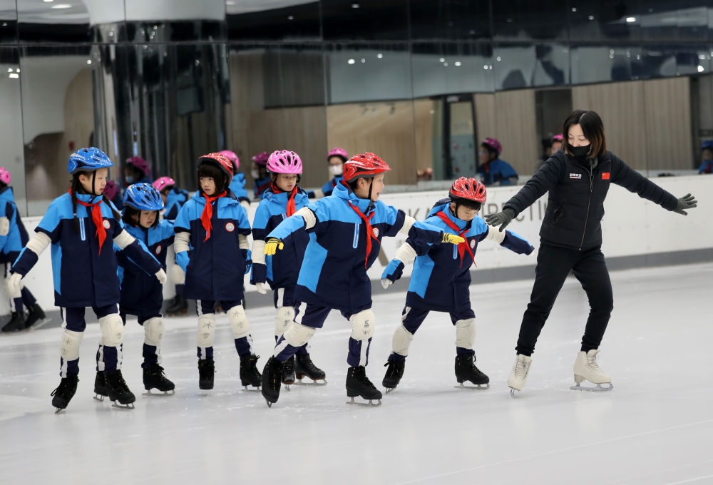 在上海新世界城的冰雪乐园,黄浦区卢湾一中心小学的学生在教练的指导下练习滑冰(2021年12月22日摄)。新华社记者 刘颖 摄