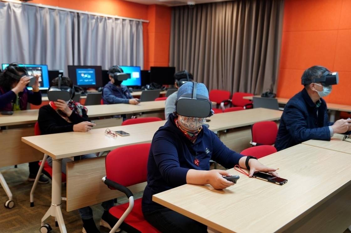 2021年11月26日,在上海老年大学钦州书院“科技岛”教室,学员通过VR虚拟体验“环球旅行”。新华社记者 刘颖 摄