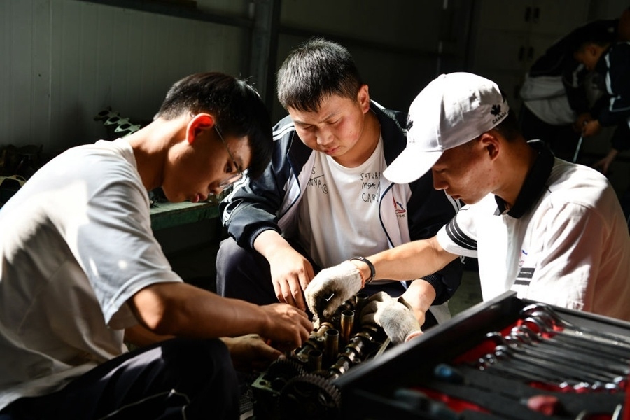 ↑2022年8月19日,在国家会展中心(天津),参加首届世界职业院校技能大赛的天津交通职业学院学生吴杰在进行发动机拆卸维护展演。