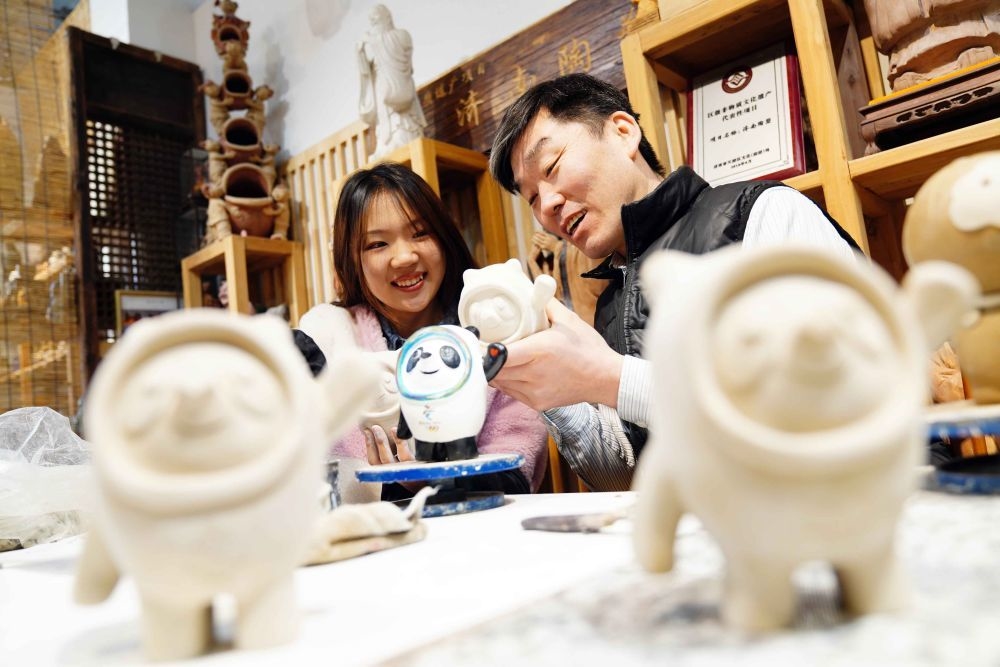 2月12日,济南陶塑非遗传承人王令涛(右)在教市民制作陶塑版“冰墩墩”。新华社记者 郭绪雷 摄